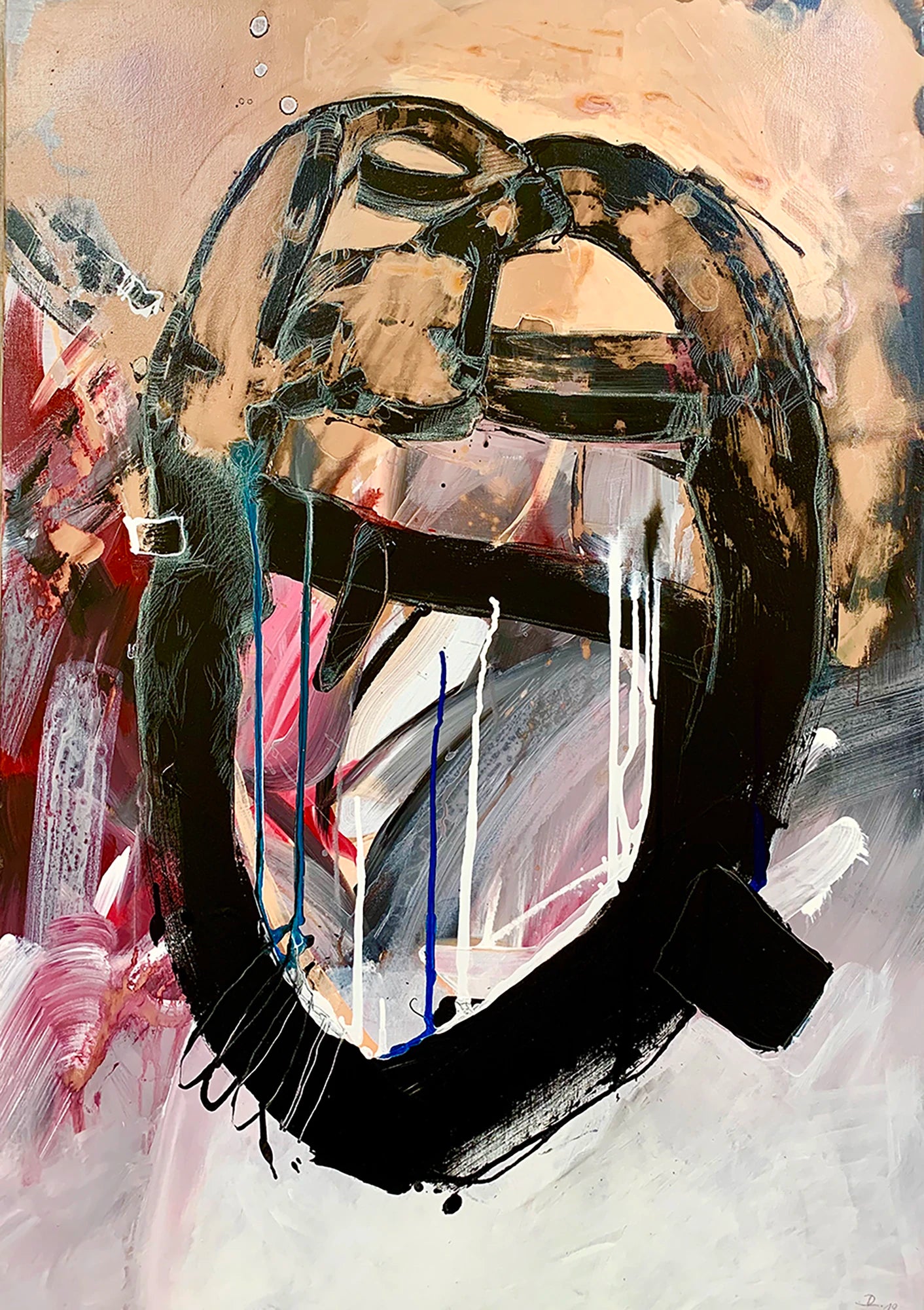 Das hochformatige Gemälde "Artefakt" präsentiert eine faszinierende abstrakte Interpretation eines geheimnisvollen Objekts, das in seinen zeichnerischen Elementen sowohl reale als auch surreale Aspekte vereint. Mit einer eindrucksvollen Farbpalette, die von schwarz über pastell-orange bis hin zu weiß, rot, hellgrau, sowie einem Hauch von smaragdgrün und blau reicht, entsteht eine archaische Atmosphäre, die an antike Ringe oder Kultgegenstände erinnert, vielleicht einst als Grabbeigabe verwendet. Diese mystische Komposition lädt den Betrachter ein, eigene Interpretationen zu entdecken und zu erforschen. Durch die vielschichtige Malerei und Lasur entsteht eine Tiefe, die das Werk in mehreren Ebenen erlebbar macht, während die dramatischen Kontraste seine Ausdruckskraft und Intensität verstärken.