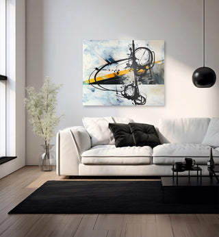 Das Gemälde 'Aufbruch' von Dominik Lommer zeigt Wendepunkte im Leben, helle Farben und eine Lebenswurzel. Es inspiriert Mutige zum Neuen und ermutigt Zögernde zum Loslassen. Ideal für Unternehmen und persönliches Wachstum. Das Bild hängt in einem hellen modernen und minimalistisch eingerichteten Wohnzimmer oder Wartezimmer.